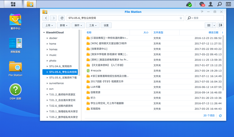 說到資料的整合,這里也不得不說一下資料的存儲與管理。學(xué)校因?yàn)轭悇e繁復(fù),文件較多且較分散,存放及調(diào)取都非常麻煩。使用 File Station 之后可以非常便利的進(jìn)行分類并存放文件,全校都可以用來存儲下載文件。通過不同的權(quán)限分配,以及不同功能的文件夾,將不同課目,不同班級等進(jìn)行整理分類后, 所有文件一目了然。