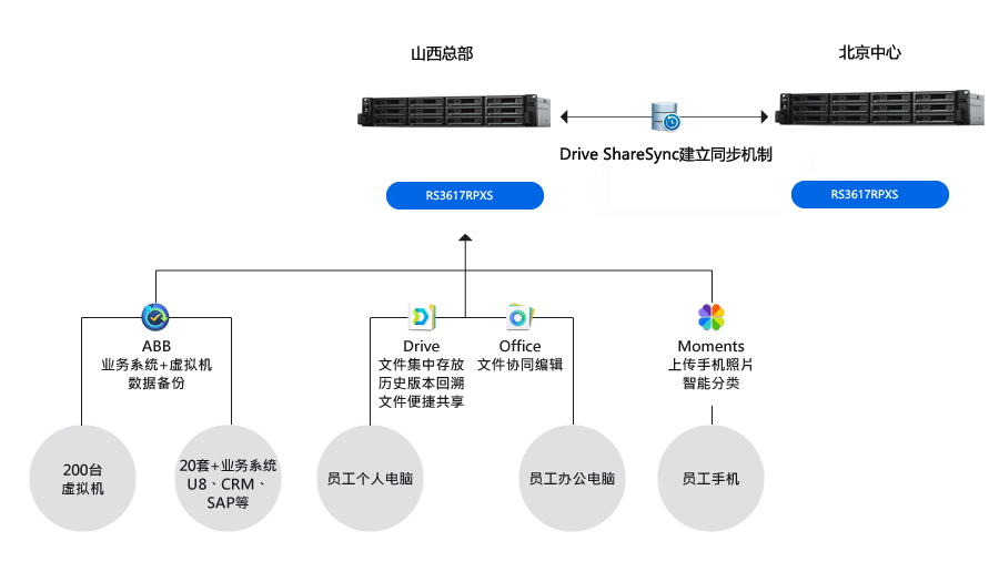 一份備份數(shù)據(jù)對公司的安全需求來說還不夠,借用群暉又進一步打造了異地備份容災(zāi)方案。振東制藥山西總部的 RS3617RPXS 的備份數(shù)據(jù),通過群暉 Drive ShareSync多分點同步功能復(fù)制到北京分公司的 RS3617RPXS 中。支持排程備份計劃。
