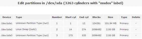 然后點(diǎn)擊磁盤“/dev/sda”,系統(tǒng)會(huì)顯示當(dāng)前磁盤的詳細(xì)分區(qū)信息。如圖