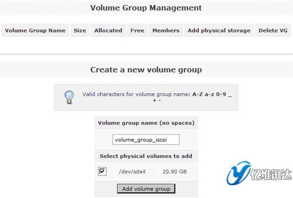 接著在右側(cè)的“Volumes section”區(qū)域選擇“Volume Groups”來創(chuàng)建一個(gè)卷組。在區(qū)域“Create a new volume group”處填寫卷組 volume group 的名稱為“volume_group_iscsi”,同時(shí)勾選剛剛在上一步所創(chuàng)建的物理卷 /dev/sda4,最后點(diǎn)擊“Add volume group”。如圖
