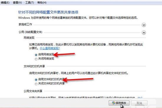 選擇 公共網(wǎng)絡(luò)---選擇以下選項(xiàng):?jiǎn)?dòng)網(wǎng)絡(luò)發(fā)現(xiàn)------啟動(dòng)文件和打印機(jī)共享-----啟用共享以便可以訪問(wèn)網(wǎng)絡(luò)的用戶可以讀取和寫(xiě)入公用文件夾中的文件(可以不選)----關(guān)閉密碼保護(hù)共享( 注釋:其他選項(xiàng)默認(rèn)即可!)