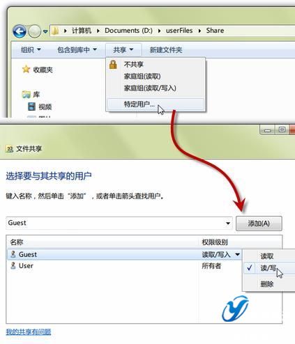 上述設(shè)置完畢,即可在Windows 7下開啟某個文件夾的共享功能,使得Mac電腦可以讀取甚至寫入文件的目的。打開需要共享的文件夾——在窗口上方的“共享”下拉菜單中點擊“特定用戶…”——在彈出的選項窗總添加“Guest”,并將權(quán)限級別進行相應(yīng)設(shè)置。